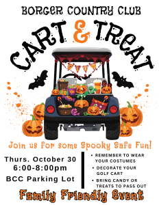 Come bring your decorated golf cart to hand out candy or bring your kids to Trick or Treat.